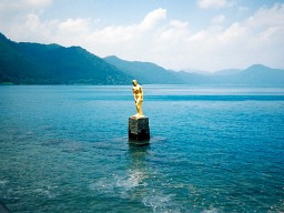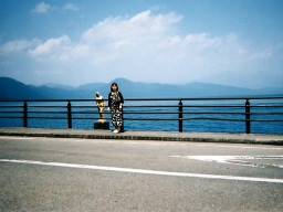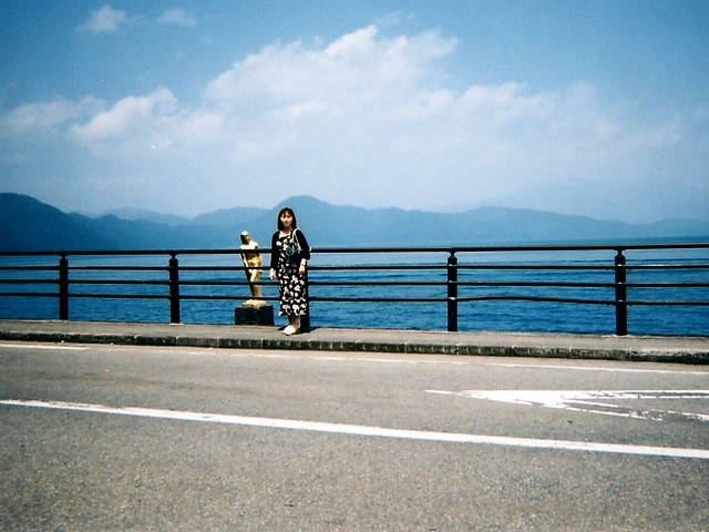 田沢湖のたつこ像の前で 天気も良く、湖の水の色もとっても綺麗でした。 |